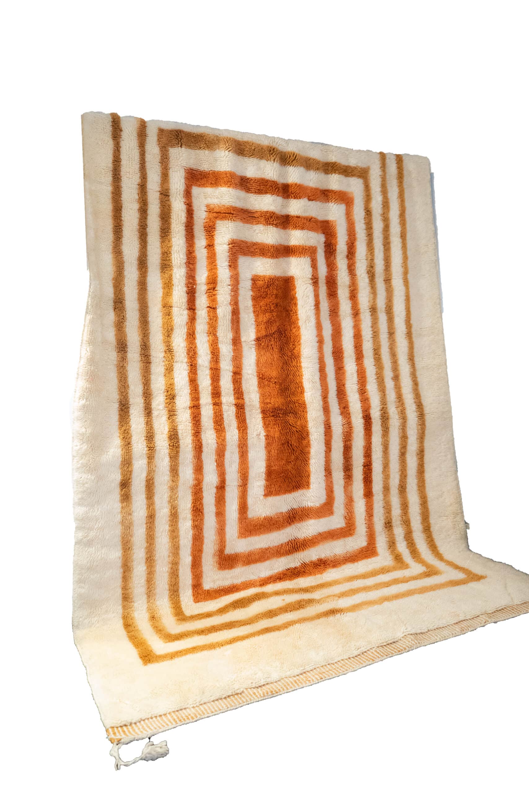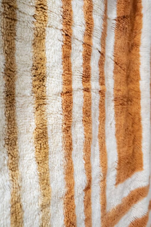 🟠 Apportez chaleur et style à votre intérieur avec ce tapis Mririt marocain en laine, noué à la main dans le Moyen Atlas et orné de motifs géométriques orangés uniques.