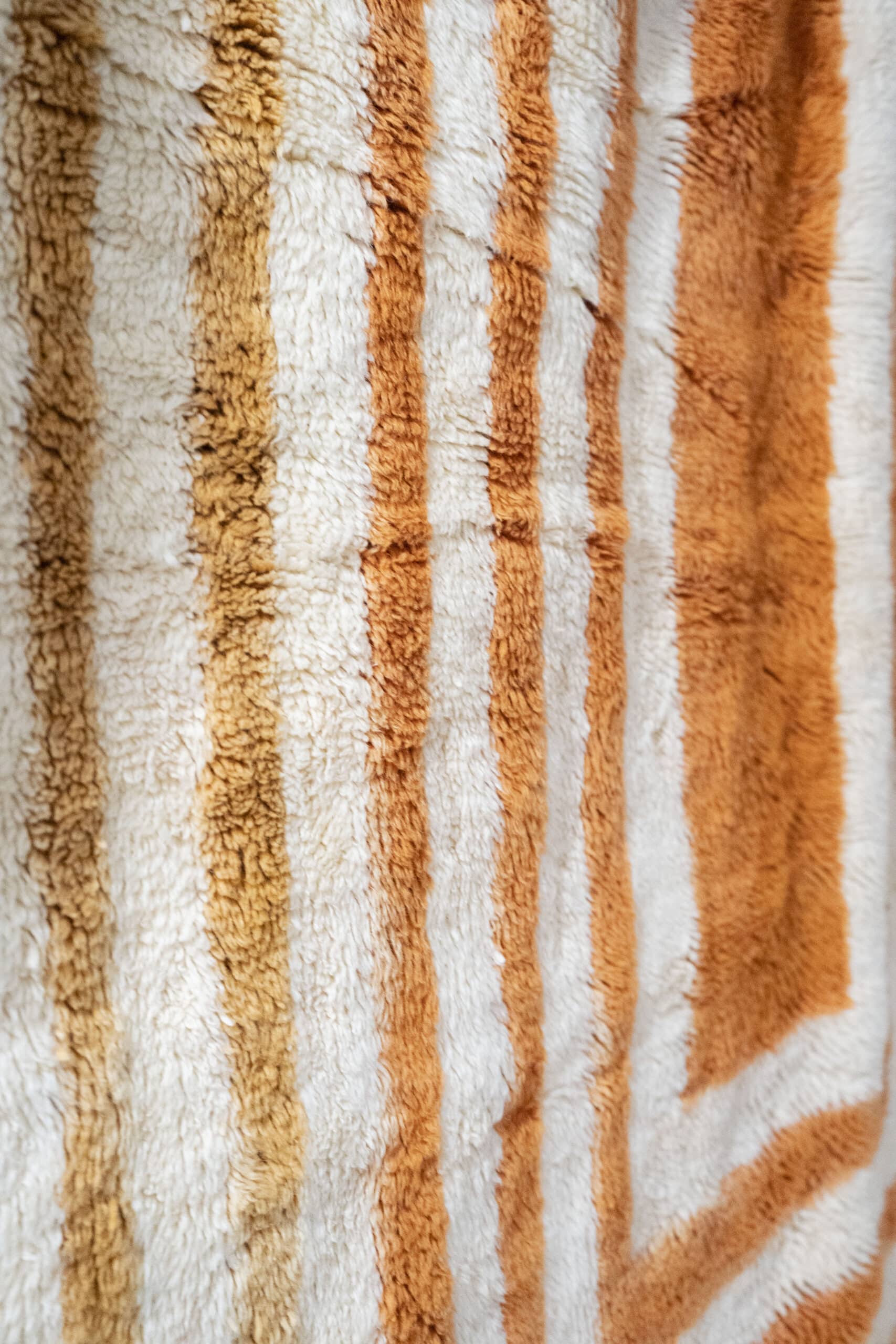 ✨ Noué à la main dans le Moyen Atlas, ce tapis Mrirt marocain en laine incarne la tradition marocaine et le design moderne avec ses motifs géométriques orangés uniques.